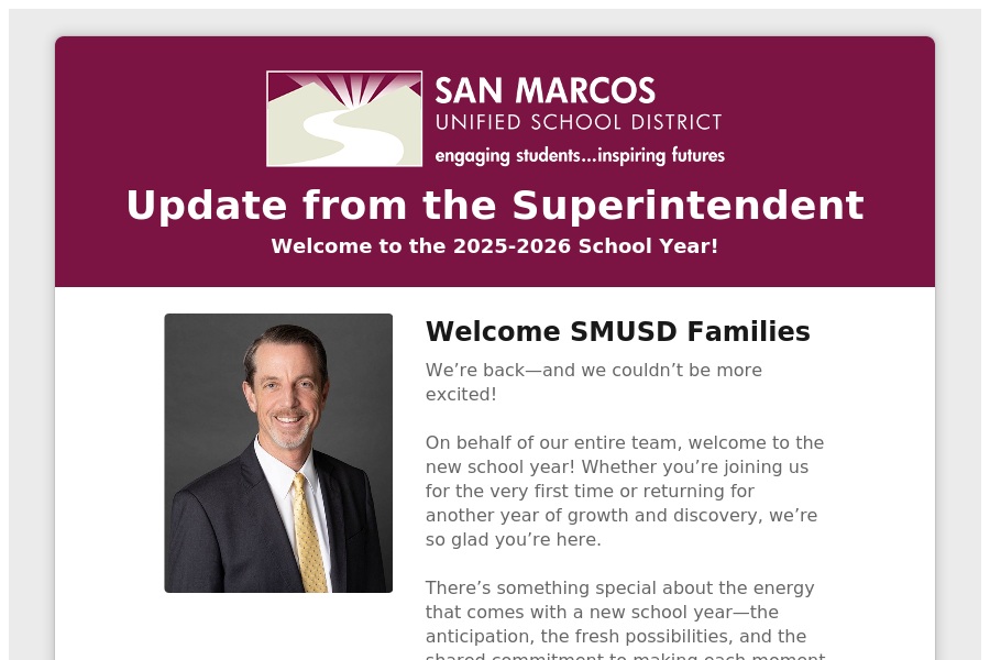 Update from the Superintendent Welcome to the 2025-2026 School Year! Welcome SMUSD Families Were backand we couldnt be more excited! On behalf of. . .